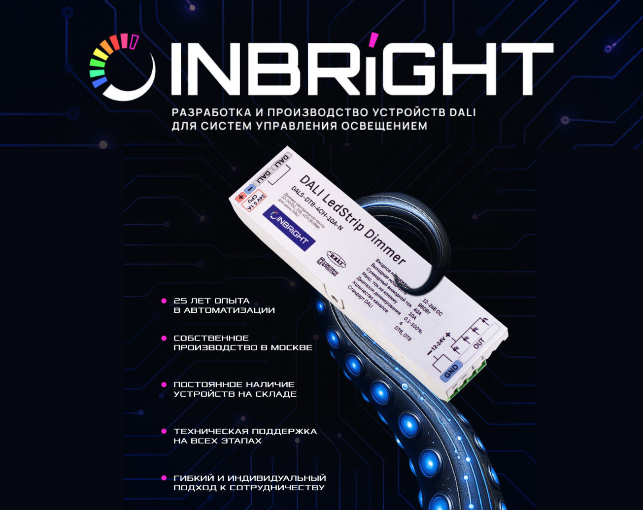 INBRIGHT — российский бренд, создающий устройства управления освещением по протоколу DALI. В списке оборудования бренда такие устройства как: контроллеры, диммеры, реле и много другое.
